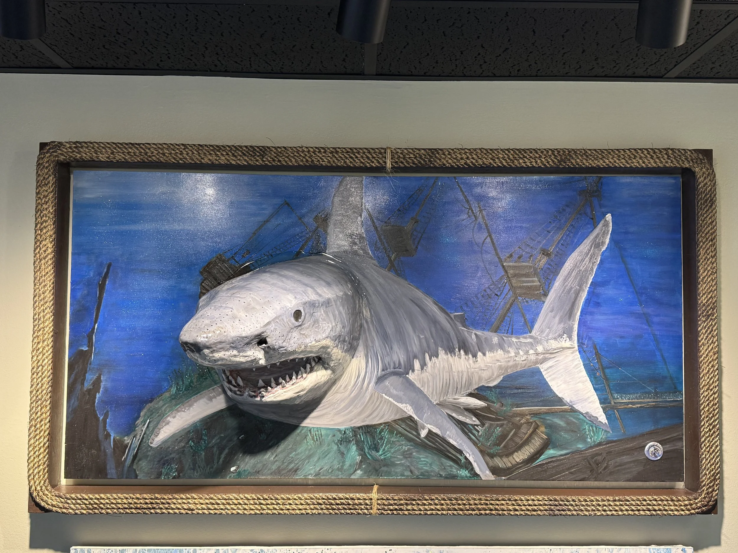 Description: Hunter of the Wreck is a monumental sculptural painting that captures the Great White Shark in full command — teeth bared, emerging from a ghostly shipwreck. Its hand-sculpted form breaks free from the canvas in high-relief dimension, nearly a foot from the surface. The background, rich with wreckage silhouettes and oceanic depth, creates cinematic tension, while the custom rope-wrapped frame brings a nautical authenticity. Finished in resin and layered acrylic, this immersive work bridges storytelling, sculpture, and seascape — ideal for collectors drawn to bold, tactile statements of strength and survival.