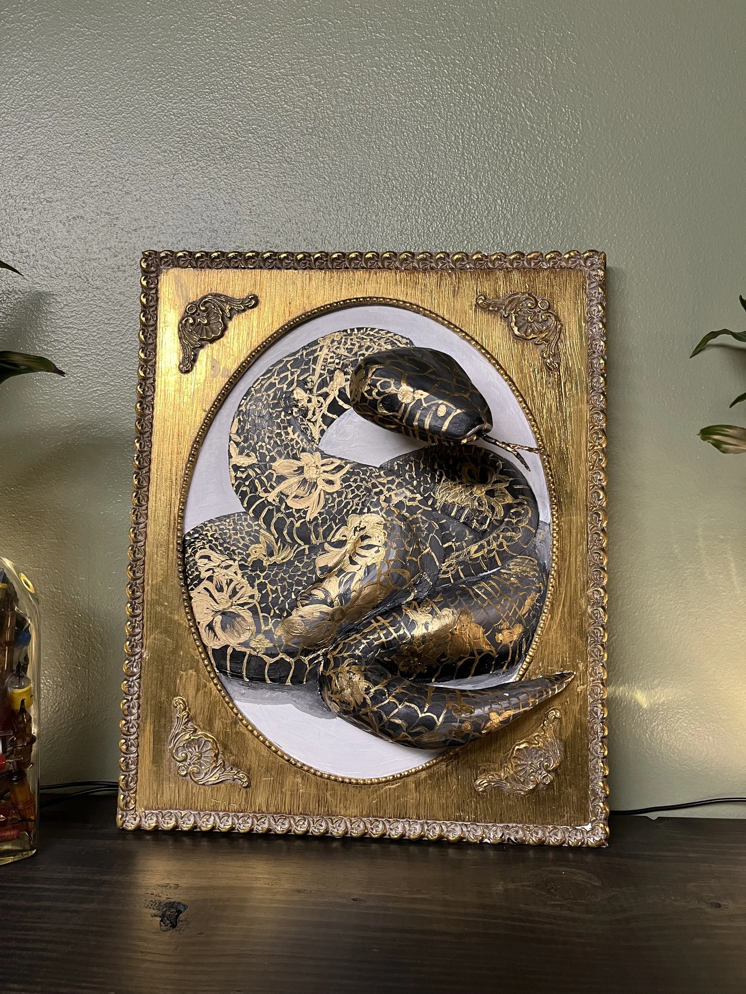 Description: A striking sculptural painting where the serpent emerges in three dimensions from a vintage gilded frame, its coiled form adorned with intricate gold florals that symbolize life’s continuous renewal. The interplay of black and radiant gold creates tension between shadow and light, danger and grace. Serpent of Eternal Bloom blurs the boundary between painting and sculpture, designed to captivate with presence and elegance in a sophisticated interior; a piece that resonates with the mystique of the Snake in the zodiac.