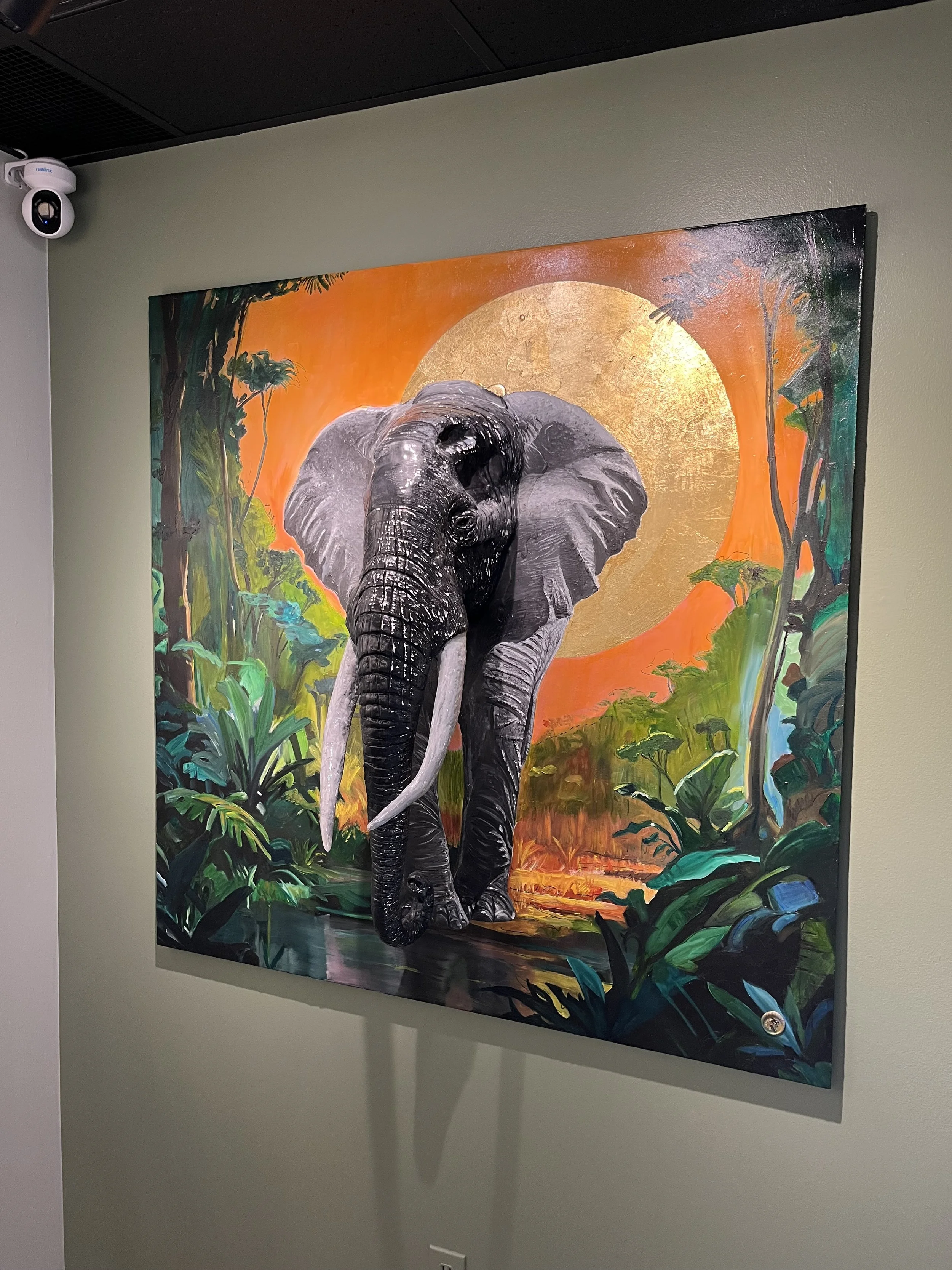 Description: An exquisite sculptural painting that reimagines the elephant — a timeless symbol of wisdom and power — with commanding presence. Whispers of the Gentle Giant is not merely a canvas, but a wall-mounted relief that extends nearly 10 inches outward, bridging painting and sculpture. Each contour is hand-carved with joint compound and layered in luminous acrylics, creating an arresting interplay of shadow, form, and texture. A deeply meditative work designed to elevate any sophisticated interior.